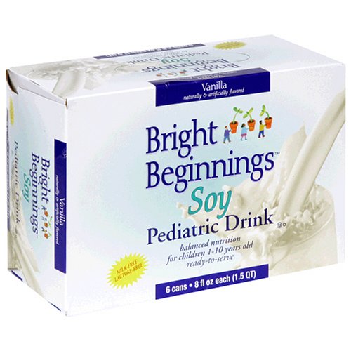 Bright Beginnings Soy Pediatric Drink is a delicious-tasting ready-to-serve vanilla snack drink that is specially formulated to meet the nutritional needs of children who may be allergic to cow's milk protein or lactose-intolerant. It provides 100% or more of the National Academy of Sciences (NAS) - National Research Council (NRC) Recommended Daily Allowances (RDAs) for protein, vitamins & minerals.